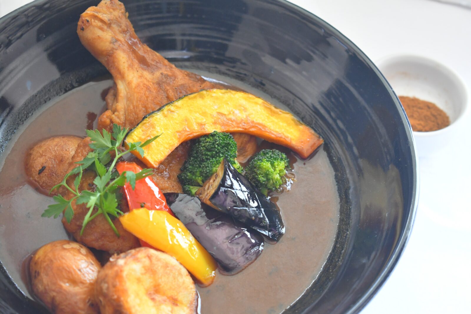 辛さの中に旨味あり。スパイスの「辛味」と食材が持つ自然な「甘味」が重なり、ひと口ごとに表情を変える奥深いスープカレーに仕上がりました。別添えの香り立つ特製スパイスでお好みの辛さに調整下さい。