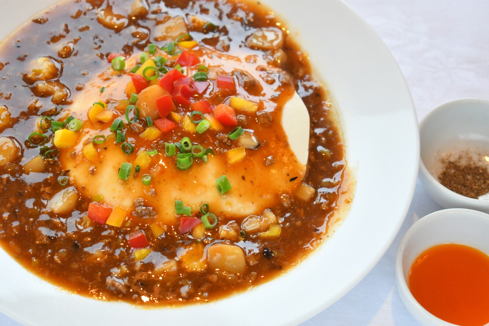 寄せ豆富を1丁使用した食べ応えのある一品。パプリカ、レンコン、くわいなどを加え、様々なシャキシャキ食感をお愉しみいただけます。辛党派には別添えでラー油、花椒をご用意、四川風をご堪能下さい。